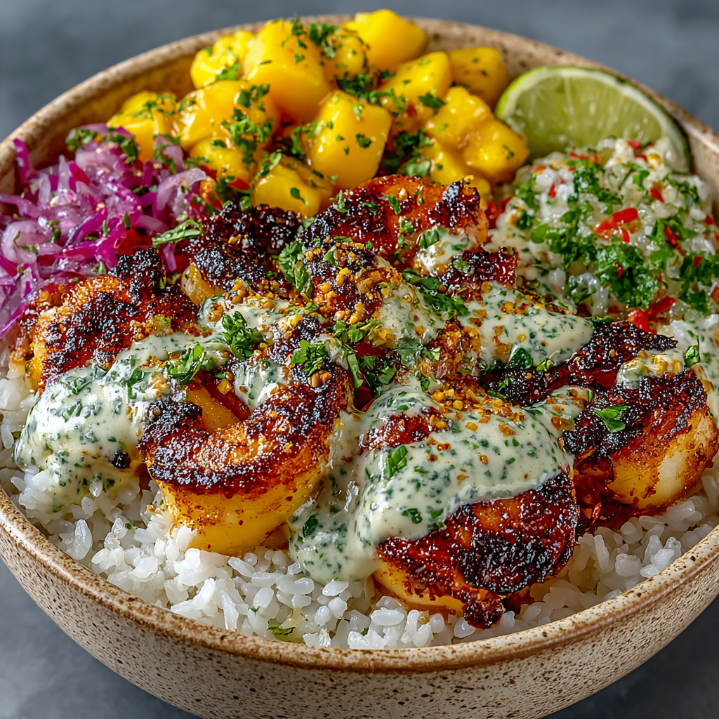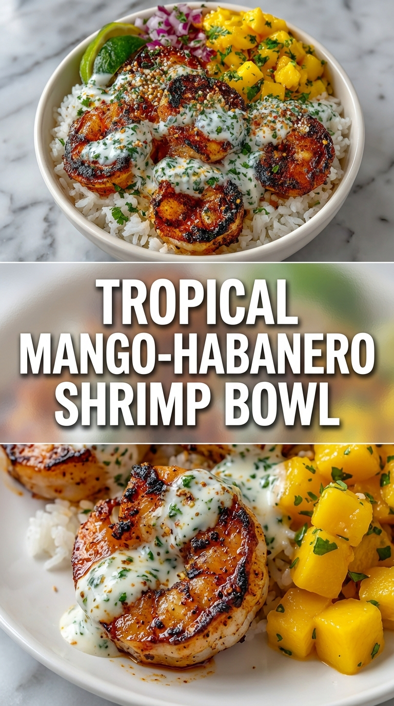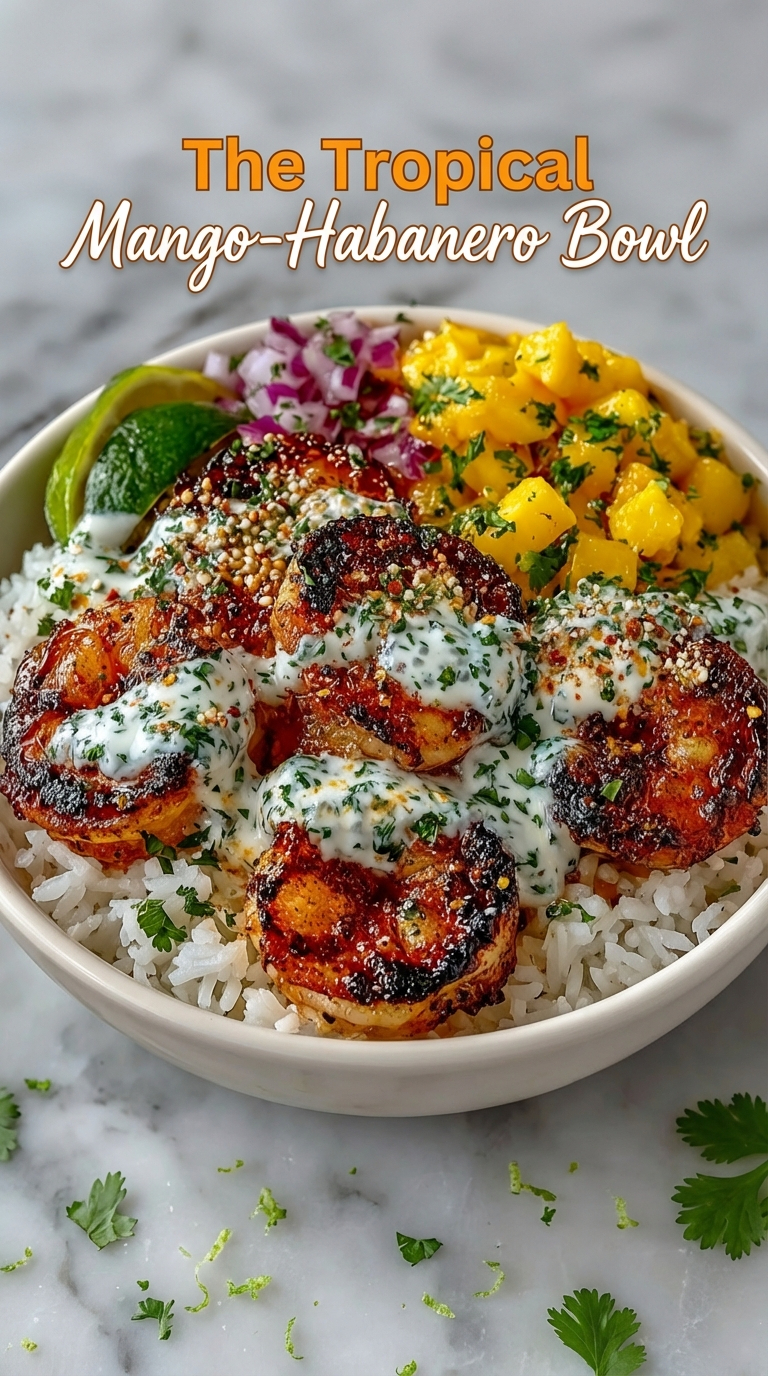 Looking for a dinner that explodes with color and bold flavor? The Tropical Mango-Habanero Bowl is exactly what you need. This vibrant bowl pairs juicy, charred shrimp with sweet, ripe mango salsa, fluffy jasmine rice, zesty pickled onions, and a creamy, cooling cilantro-lime sauce that ties everything together. Every bite is a taste of the tropics—spicy, sweet, fresh, and utterly satisfying.