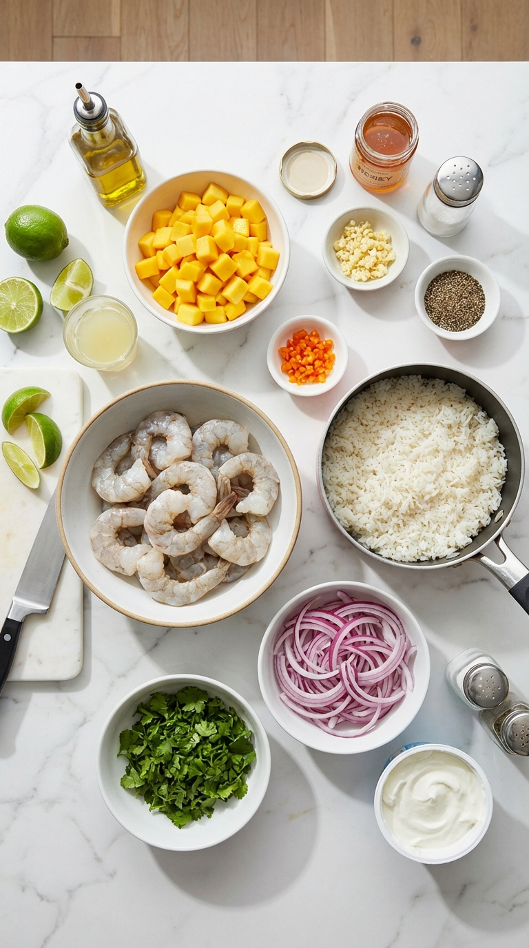 To each bowl, add a base of jasmine rice. Top with seared shrimp, spoon over mango salsa, quick-pickled onions, and a generous drizzle of cilantro-lime sauce. Garnish with extra cilantro and lime wedges if desired.
